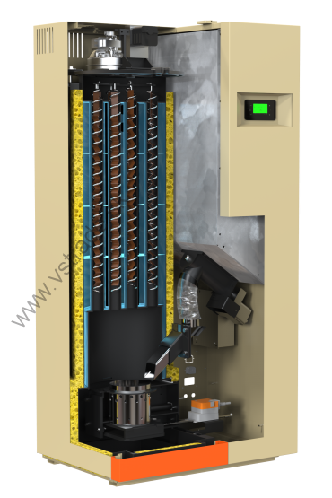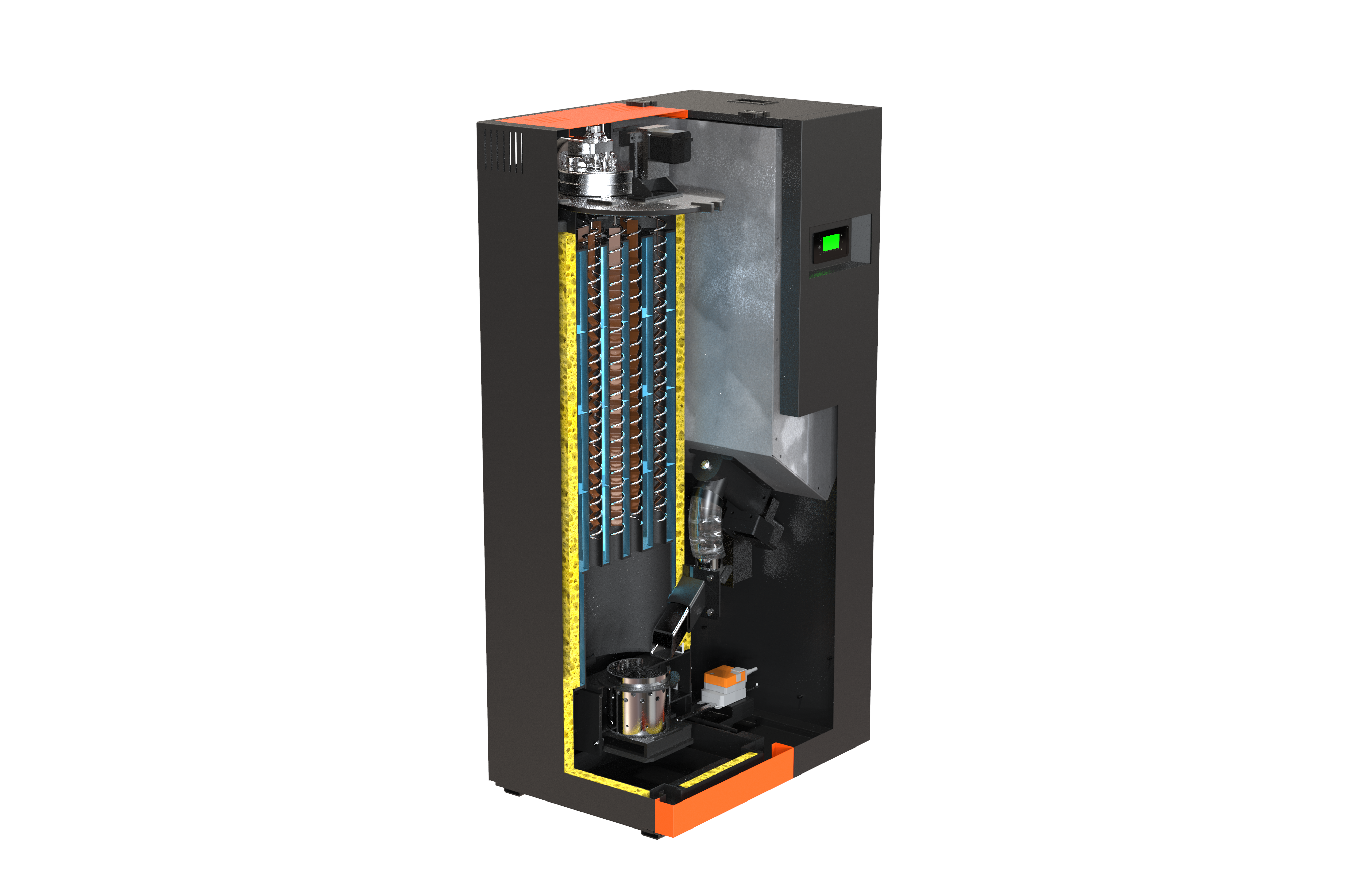 • Automatické čistenie výmenníka tepla: Kotol je vybavený mechanizmom, ktorý pravidelne čistí výmenník od nánosov spalín a popola. To udržiava jeho povrch neustále čistý, čo zaručuje konštantne vysokú účinnosť a optimalizuje spotrebu paliva. Už žiadne manuálne čistenie, ktoré by znižovalo výkon kotla!